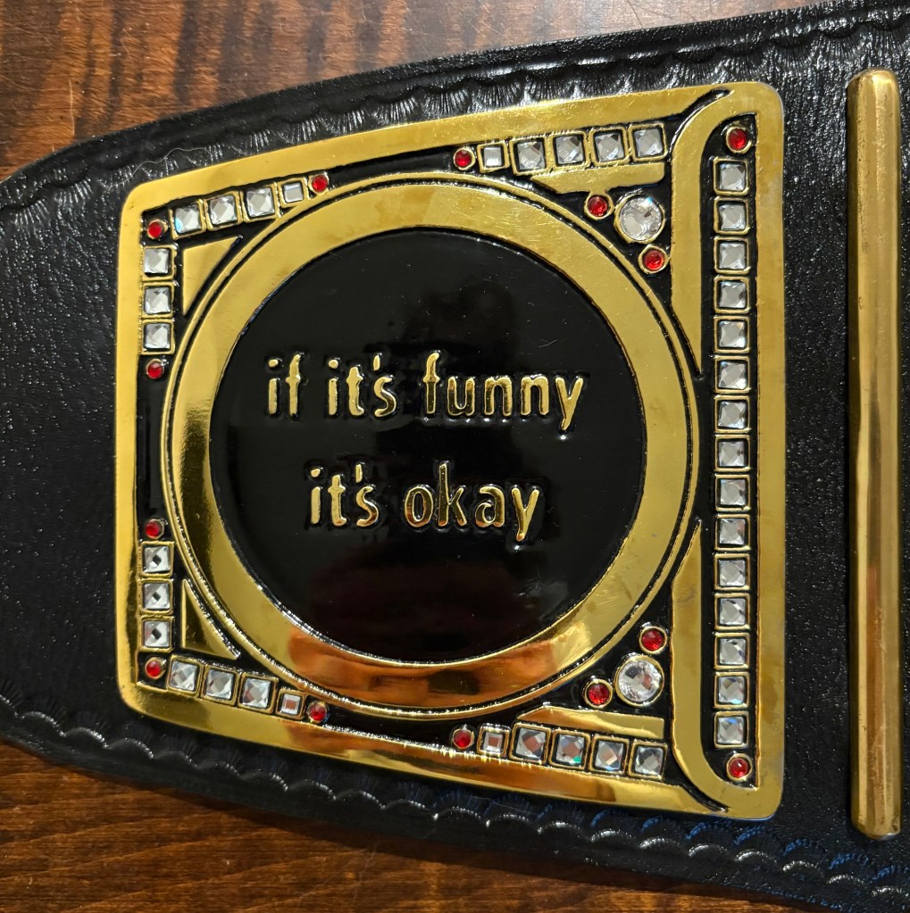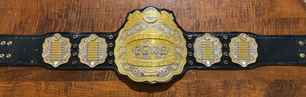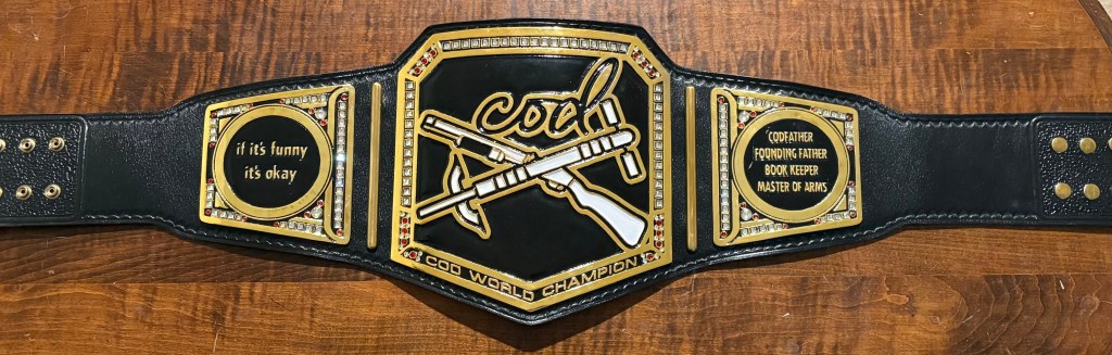 9. The 2nd and current custom COD title, introduced in December 2024. This one replaced the CGWC Belt and opened up the COD World Championship to other contests outside of golf. The Left plate has the COD motto “if it’s funny, it’s okay” while the right plate has the titles of the core four members of COD. 1 of 1